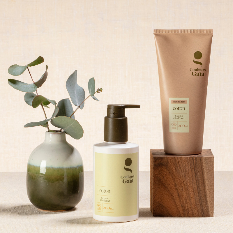 Le duo baume et son éco-recharge Coton : un format responsable, pensé pour prendre soin de vos cheveux tout en réduisant votre impact.