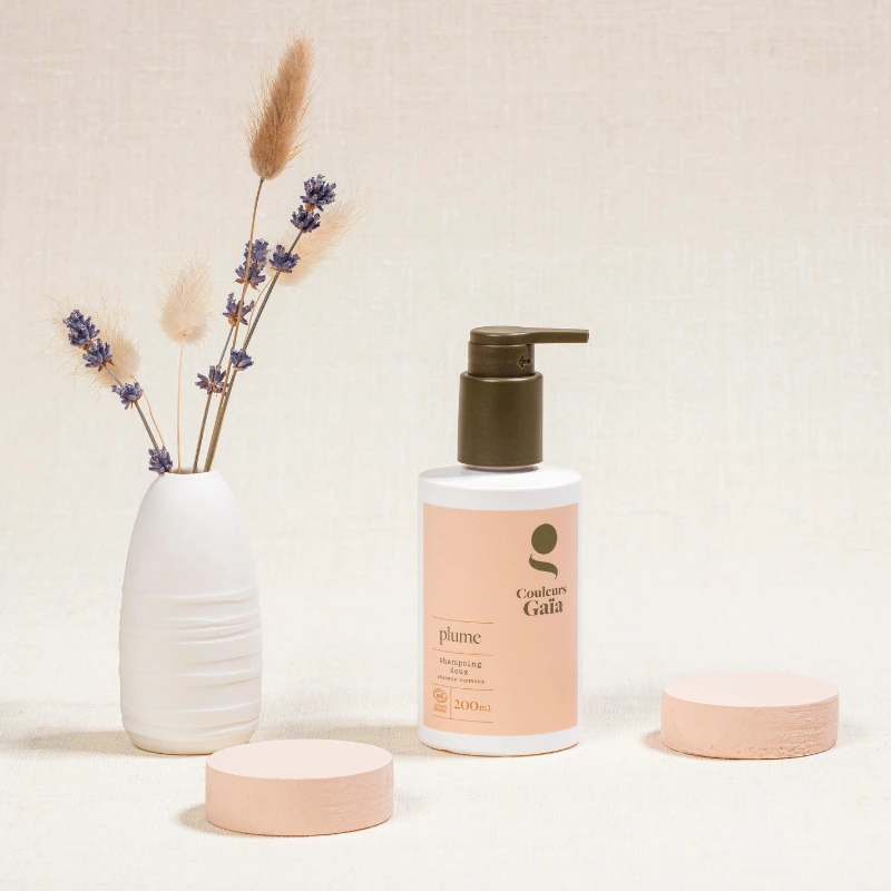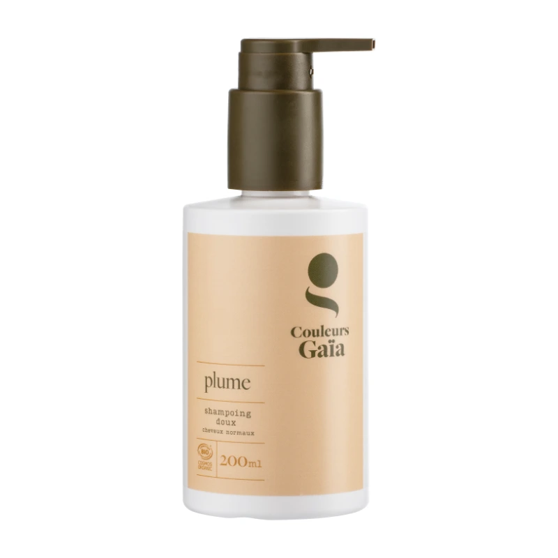 Parmi la gamme de shampoins bio Couleurs Gaïa, Plume est conseillé pour les cheveux normaux ou colorés en végétal. C’est un shampoing pour usage fréquent, doux et respectueux du cheveu et de l’environnement. Il est adapté aux cuirs chevelus sensibles et aux enfants.