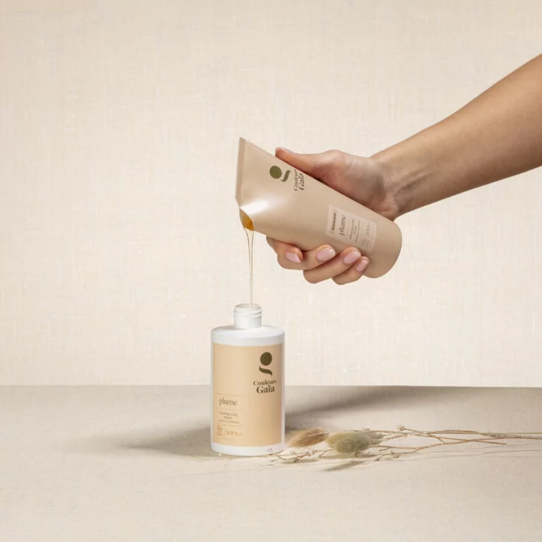 C’est un contenant souple en monomatériau 100% recyclable, conçu pour recharger les flacons Couleurs Gaïa 200ml existants. Elle contient la même formule bio que le flacon original, mais génère jusqu’à 75% moins de plastique.